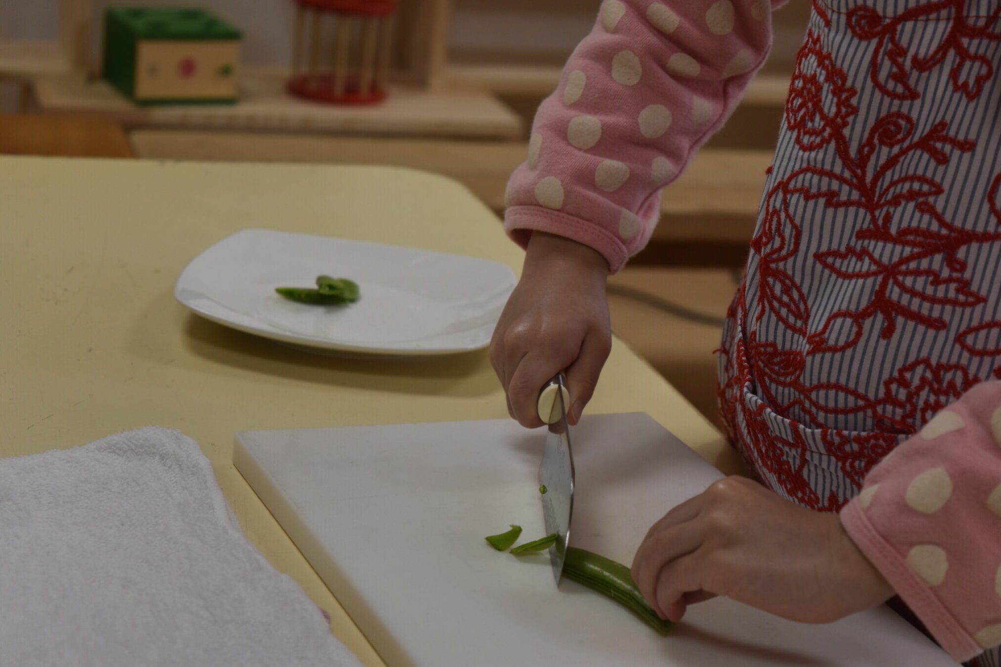 湯出てお湯を通したスナップエンドウ・ちくわ・かまぼこで桜の木を作っていきます。