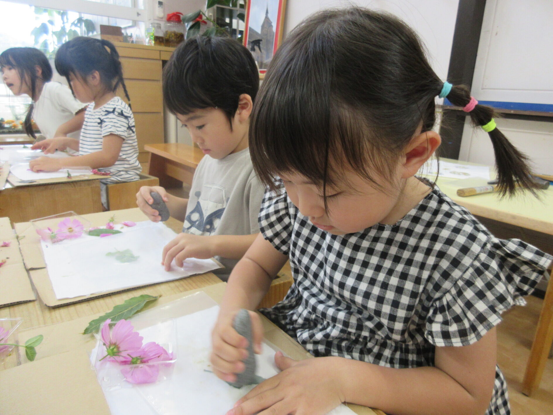 「このお花かわいい!」「みて!これとかいいんじゃない?」「これ(ほそながいお花)でやったらどうなるんだろう」「これつかってみたい!」と、たたき染めに向けてイメージを膨らませながら友達と楽しそうに話す声があちこちから聞こえてきました。