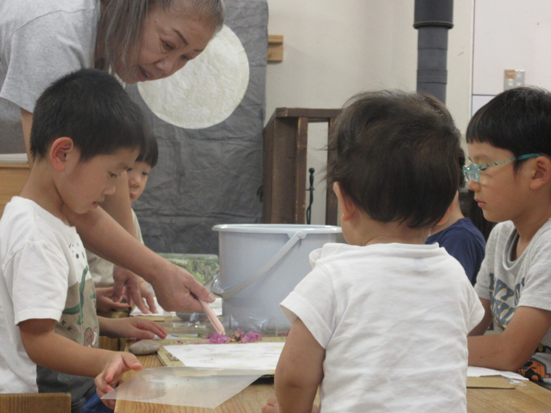 活動の中で、「この葉っぱはかたいから、色が出にくいな」「こっちのほうがやわらかくて出やすい!」という発見もあり、後半は色が出やすそうな葉っぱを自分で選びながら進めていました。