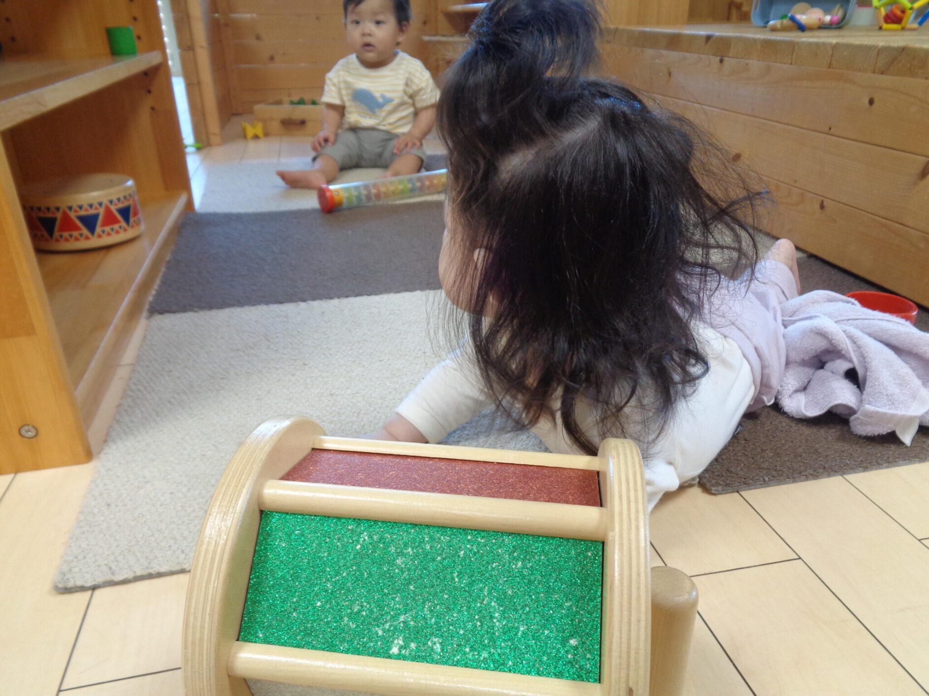 ベビーローラーというくるくる回って、音がするおもちゃで女の子が遊んでいました。