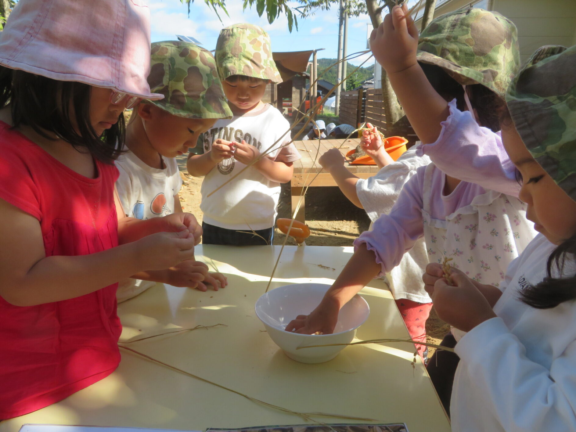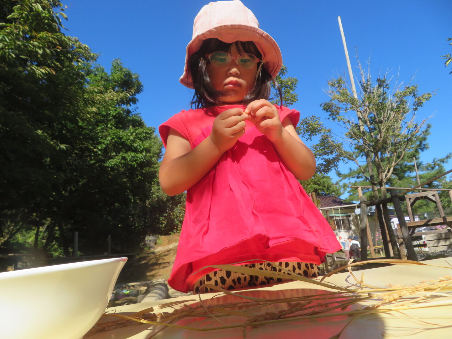 興味を持ったようで保育者の真似をして脱穀を始めました。