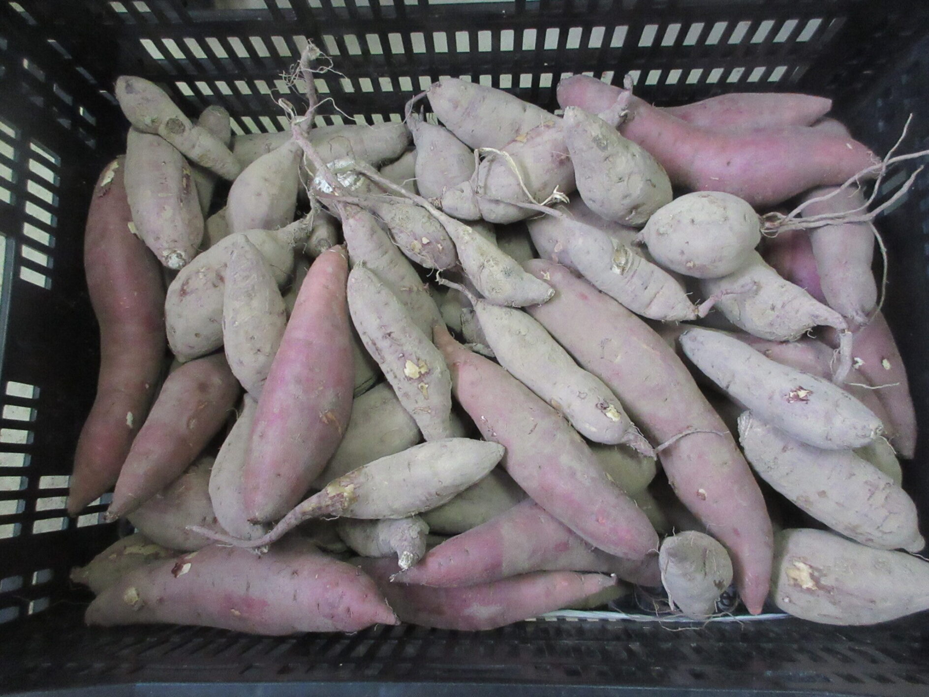 畑で収穫したさつまいもがコンテナいっぱいあります。