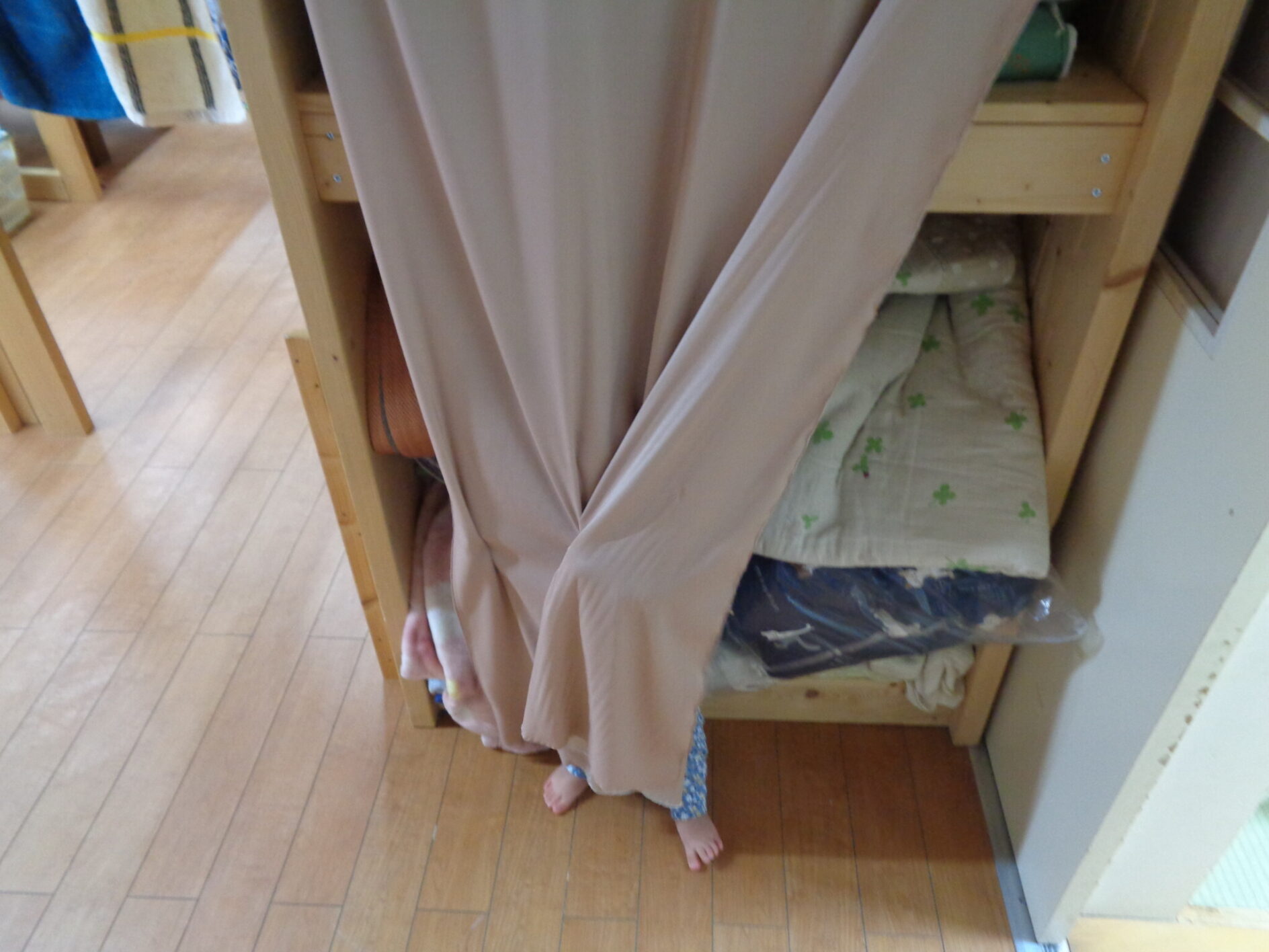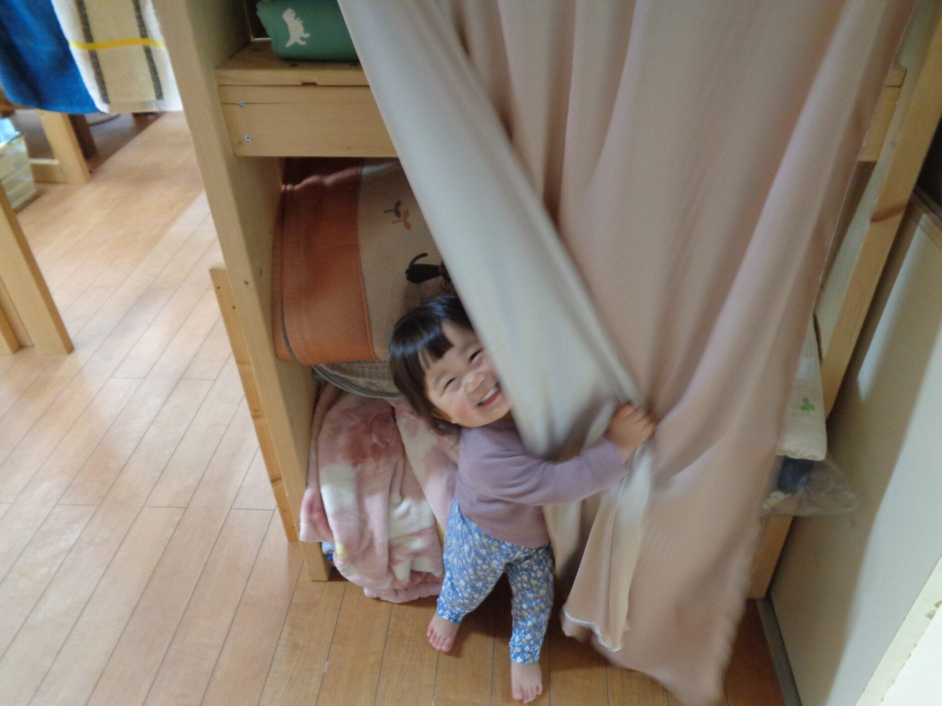 「あれ?」と保育者が言うとカーテンの中から「うふっ」とほほ笑む声が聞こえてきました^^