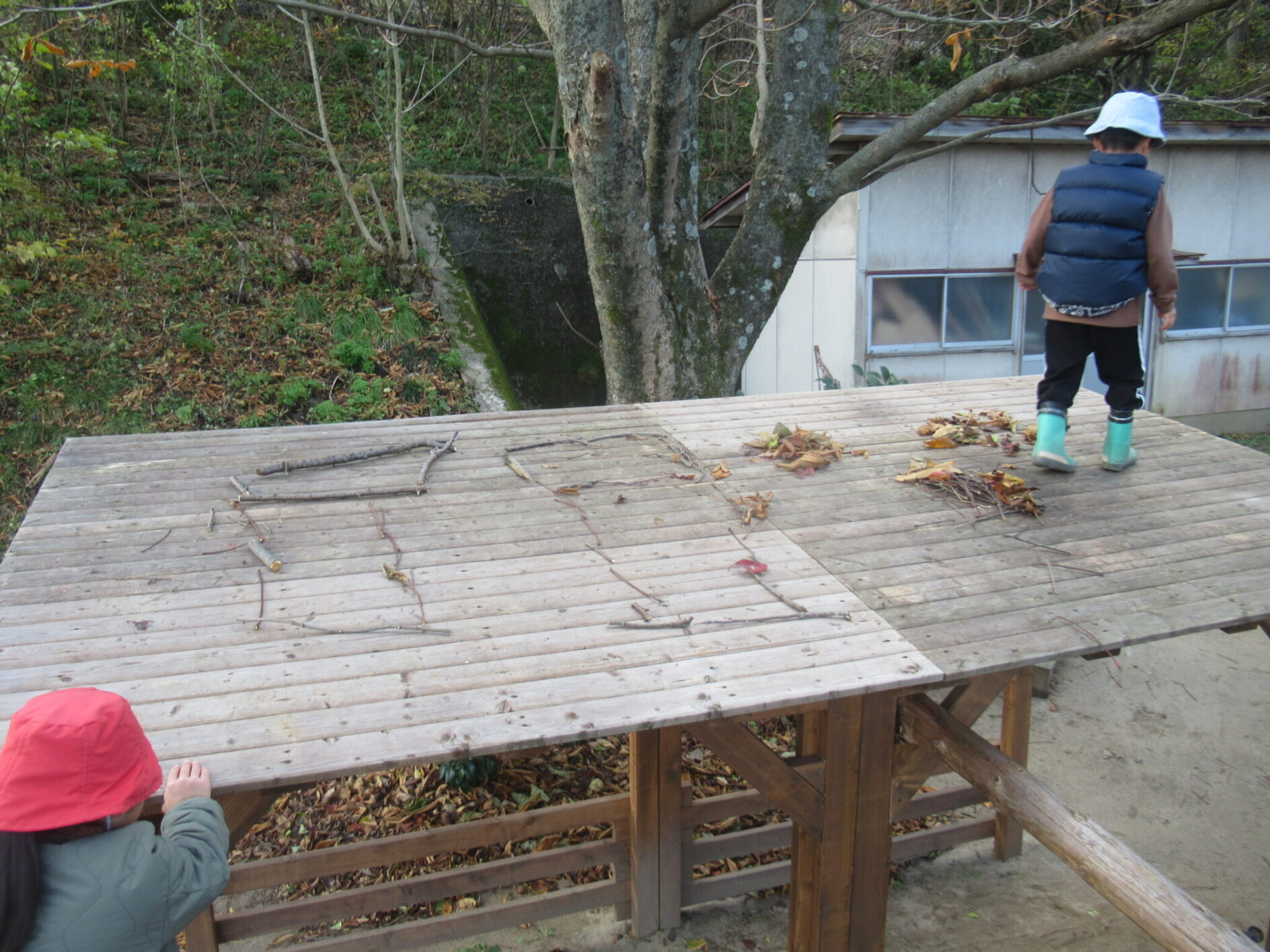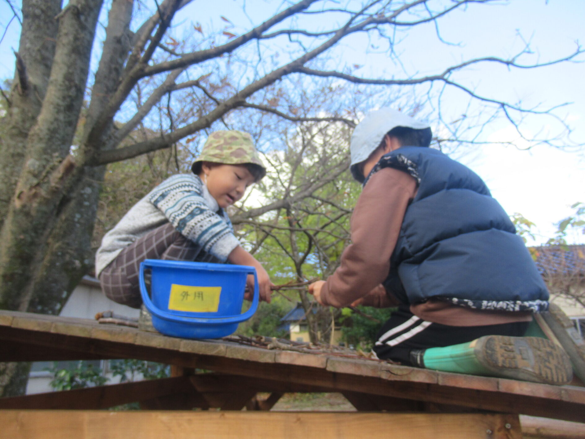 木の枝を拾い集め、せっせと自転車小屋へ運ぶ年長の男の子。