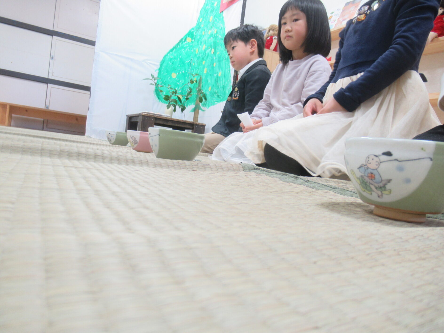 相手を思うやさしい気持ちを交わす体験をしています。お茶をいただいた後は、器の絵を相手に向けるという事をつたてみました。