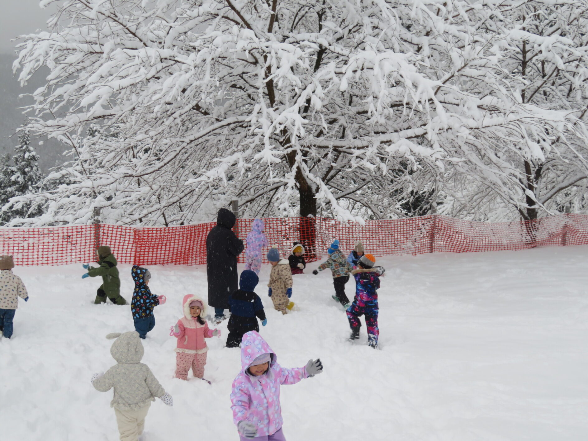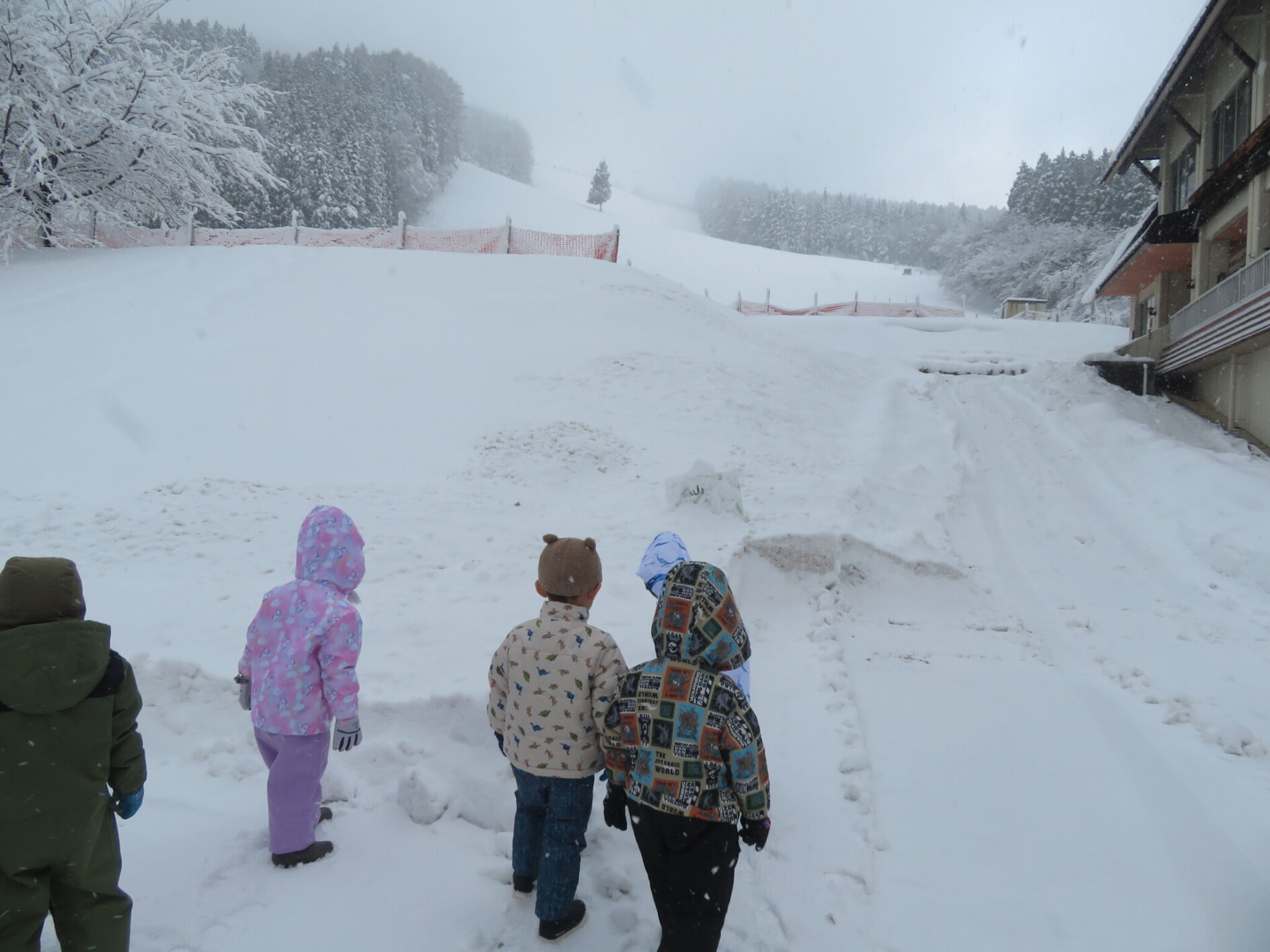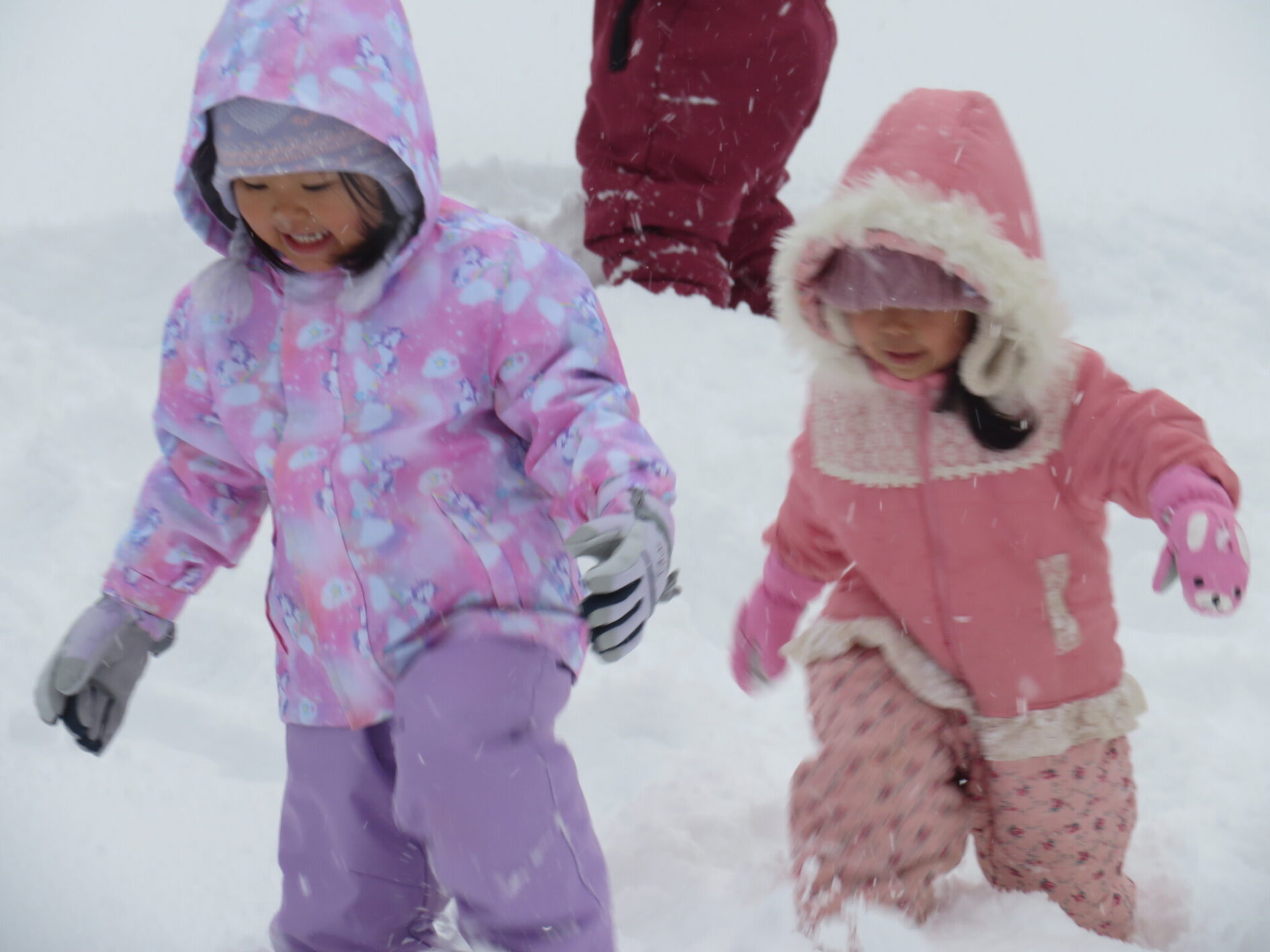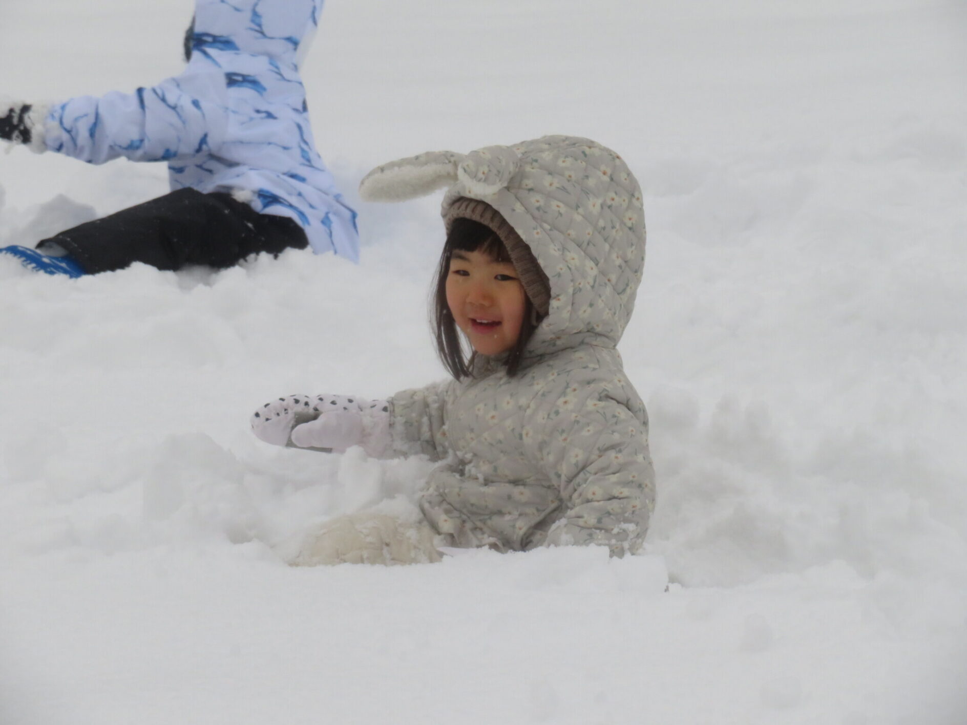 子どものひざまで積もった雪でした。ふわふわの雪の中をどんどん進んでいく子どもたち。