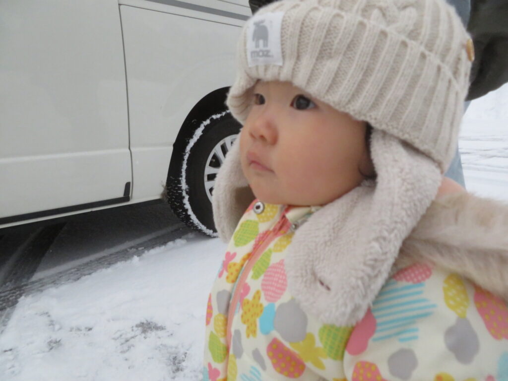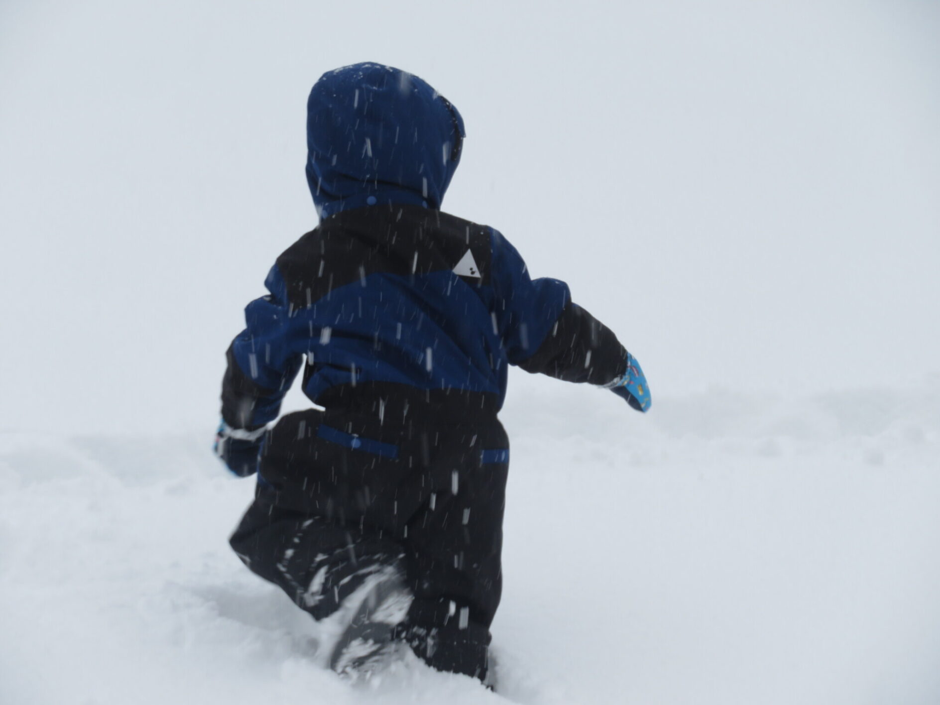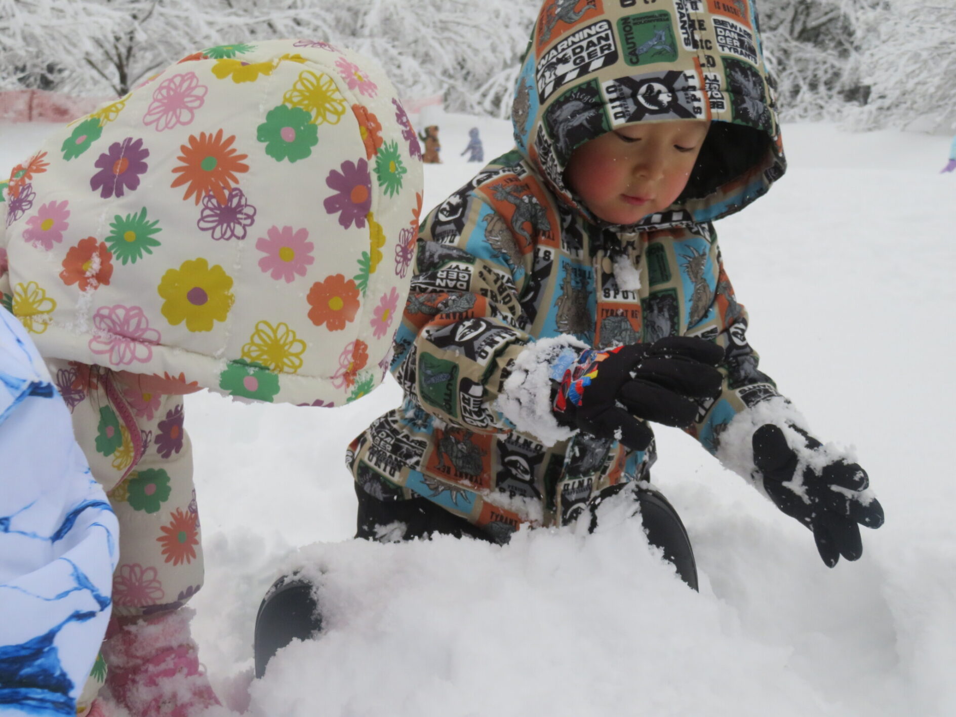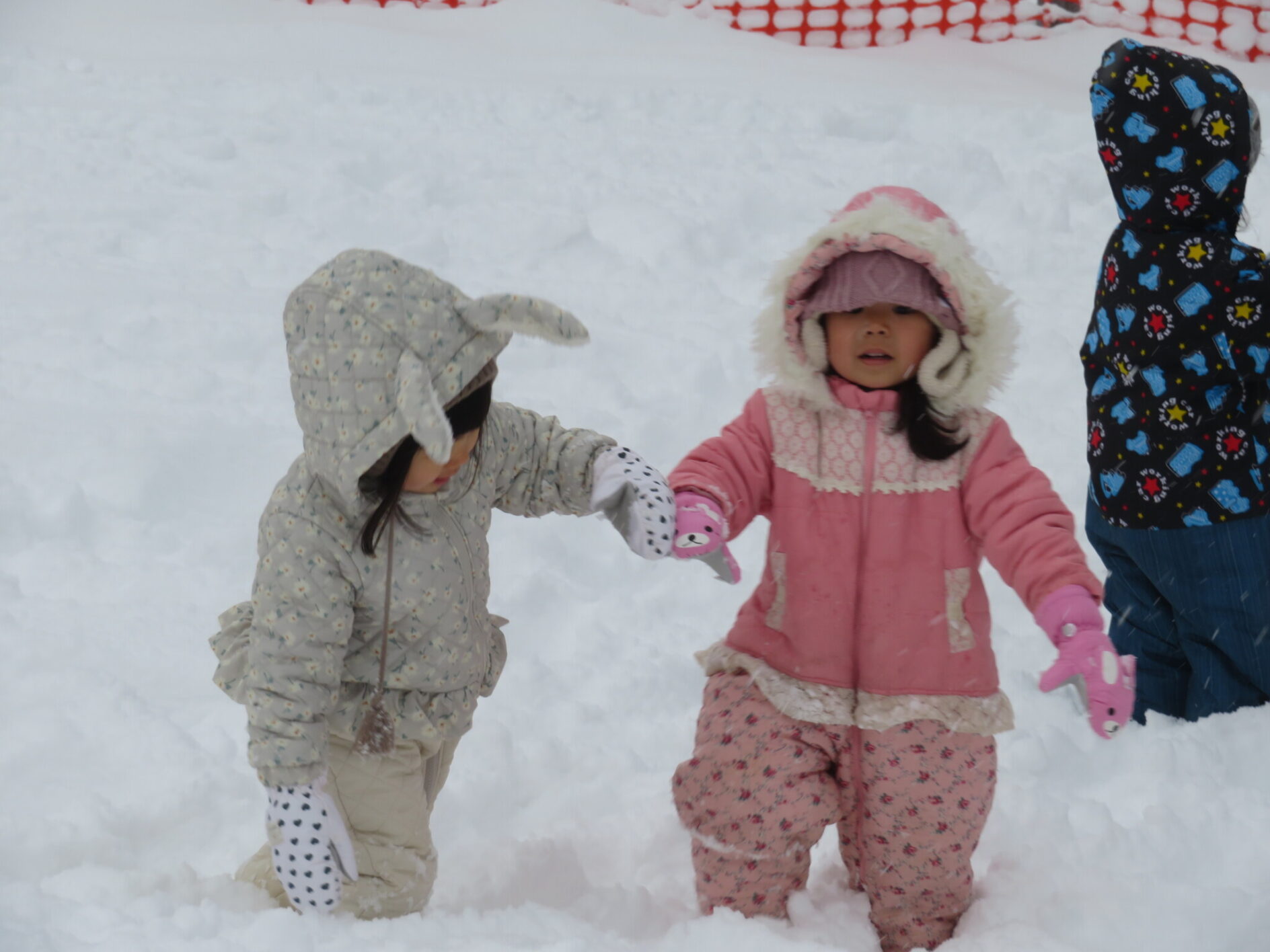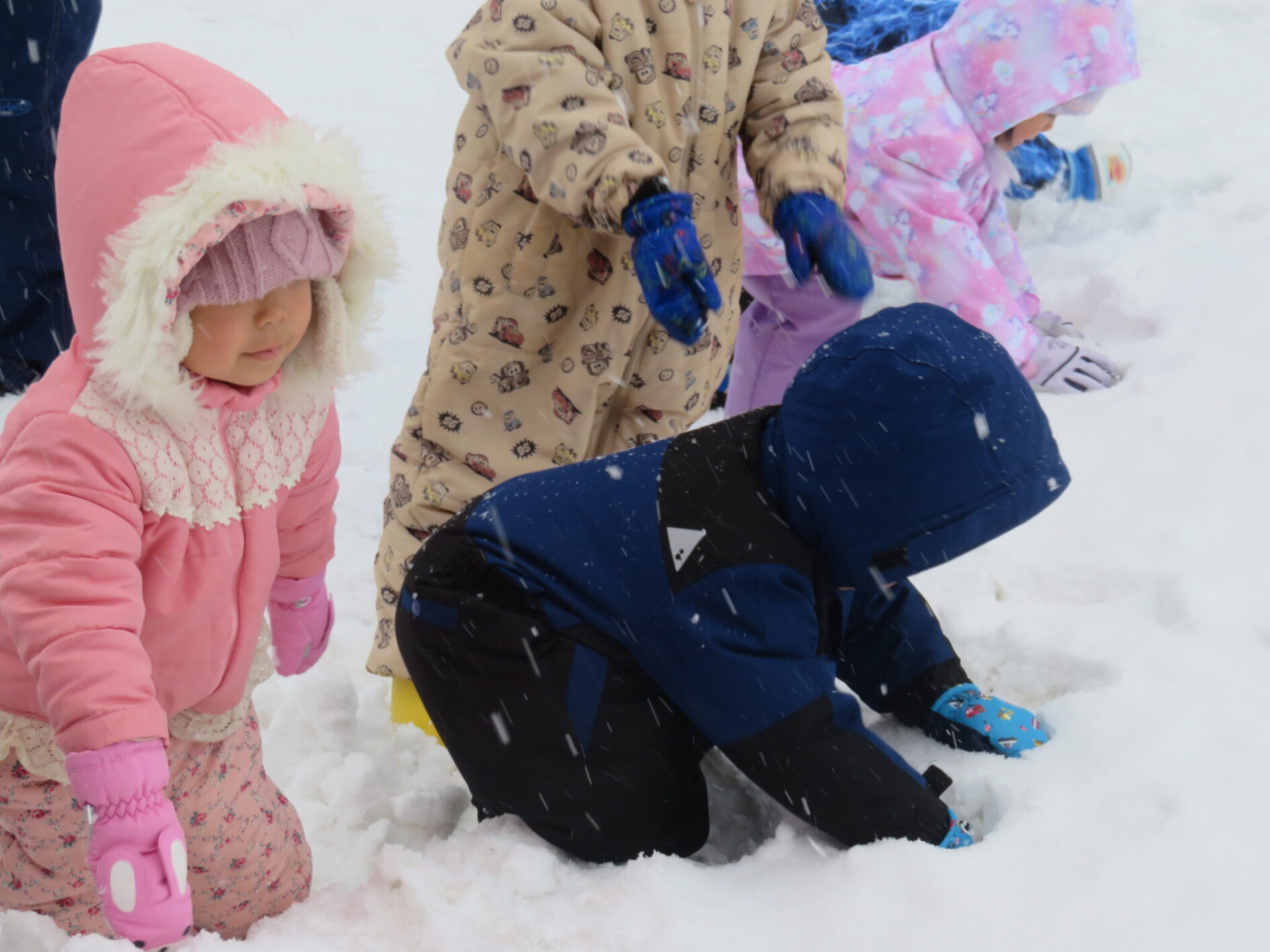 子どものひざまで積もった雪でした。ふわふわの雪の中をどんどん進んでいく子どもたち。