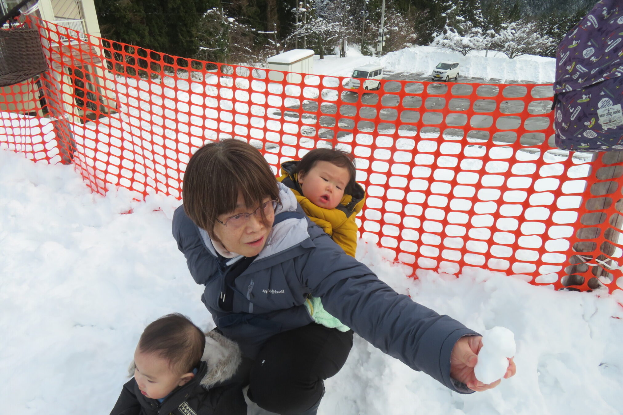保育者に抱っこやおんぶをされて壮大な雪景色を
