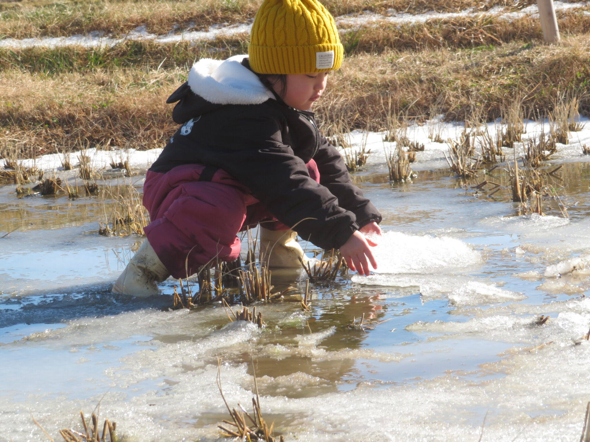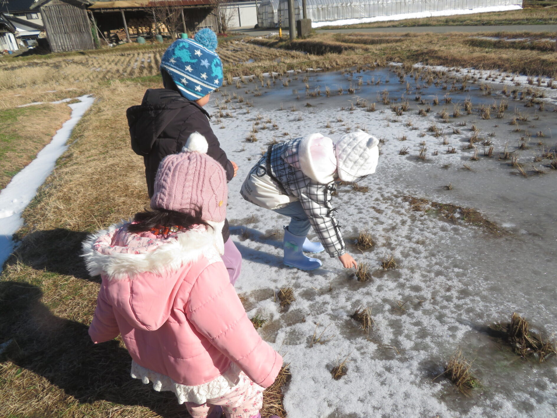田畑に着くとすぐに5歳児の女の子が田んぼが凍ってる・・・・と、気づきました。