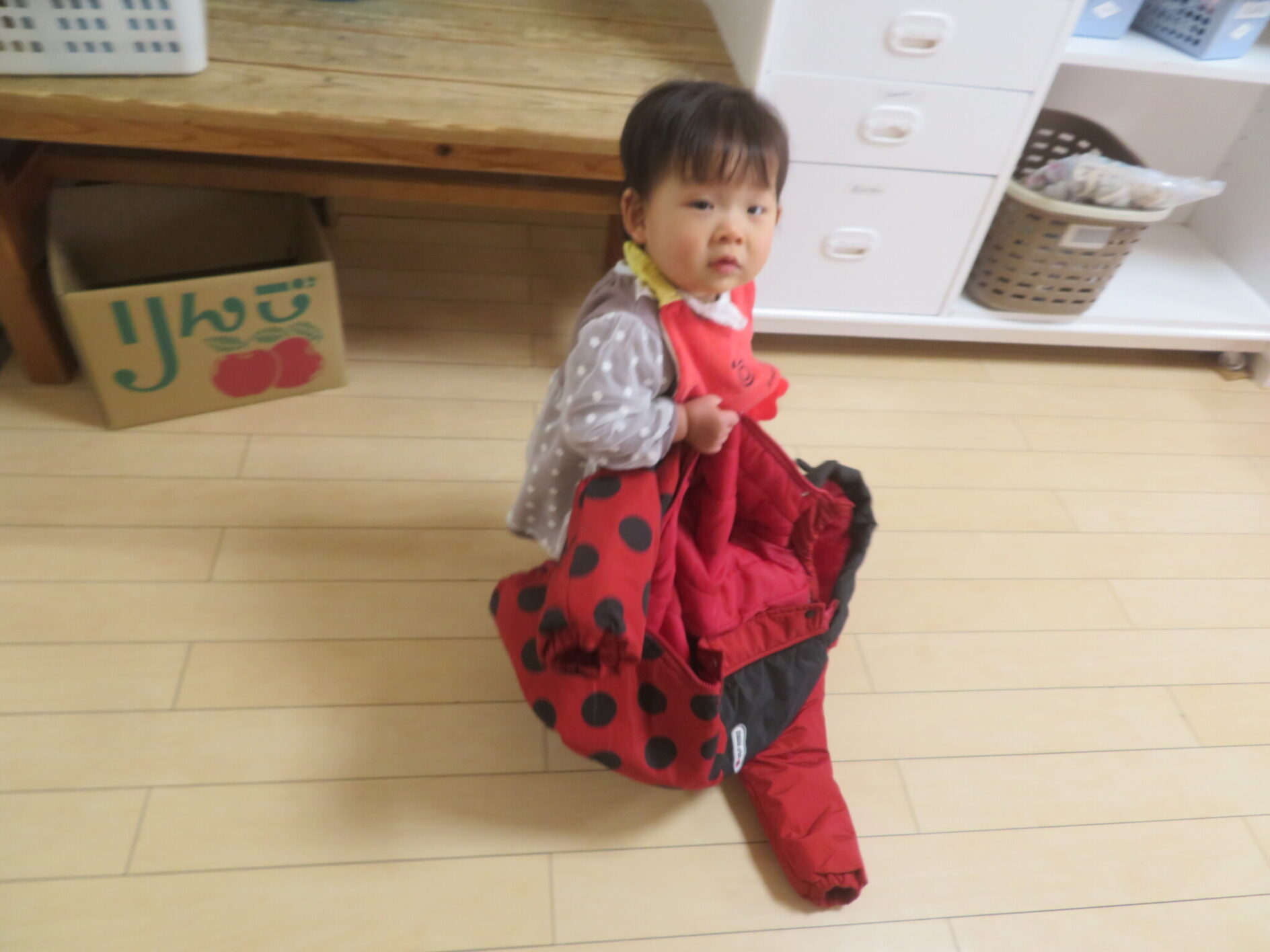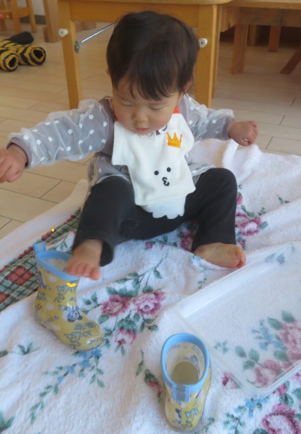 もう一人の女の子は後ろにある自分のスキーウェアーを広げた後玄関に長靴を取りにいき、履いてみようと足を上げていました。
