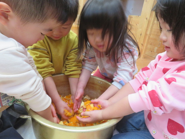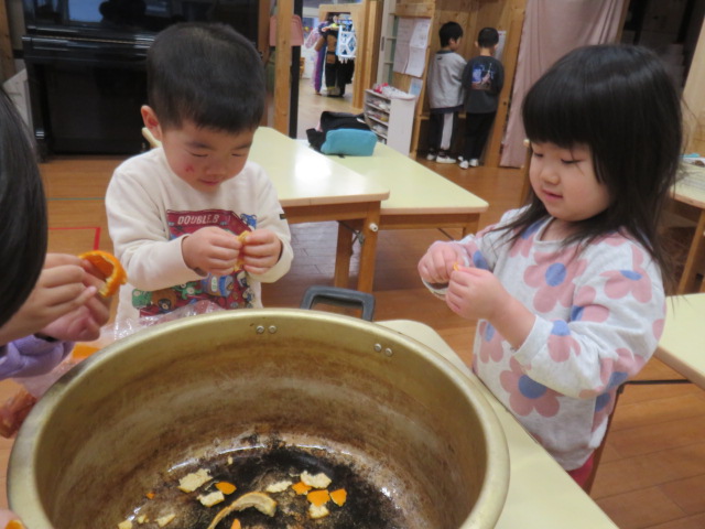 2月のお茶会の染め物は、ミカンの皮で行いました。