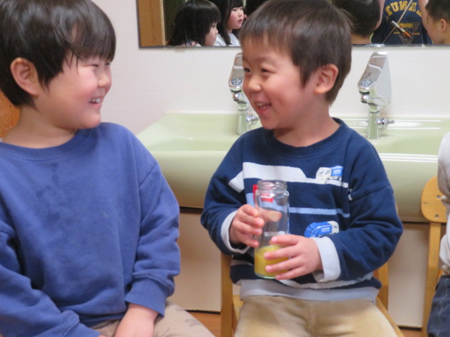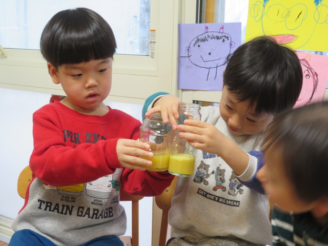 帰りの会の時間、どんな色になったか見ると、「オレンジジュースみたい!」と