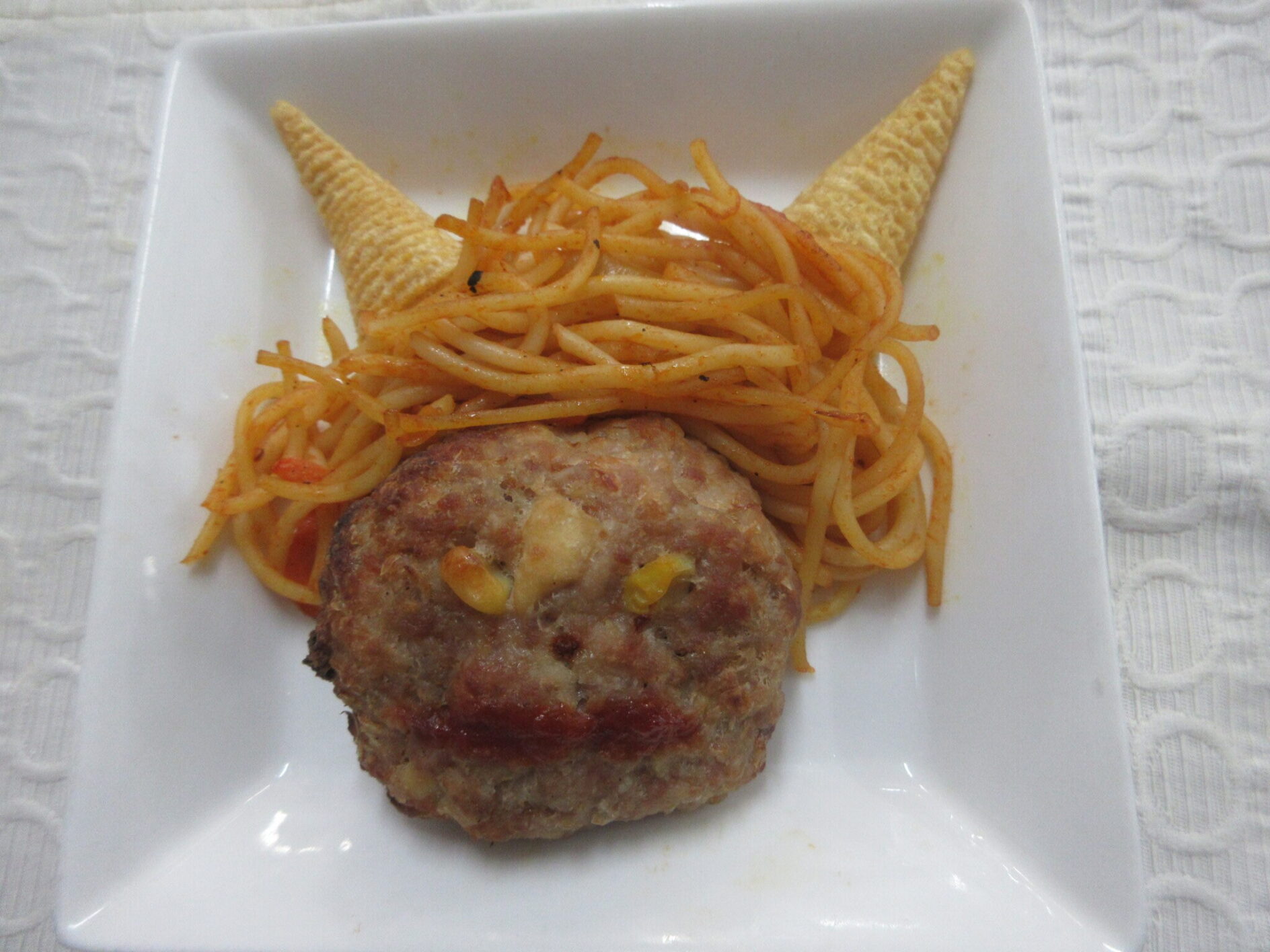 おにの目はコーン、髪はパスタ、角はとんがりコーンで飾ってみました。