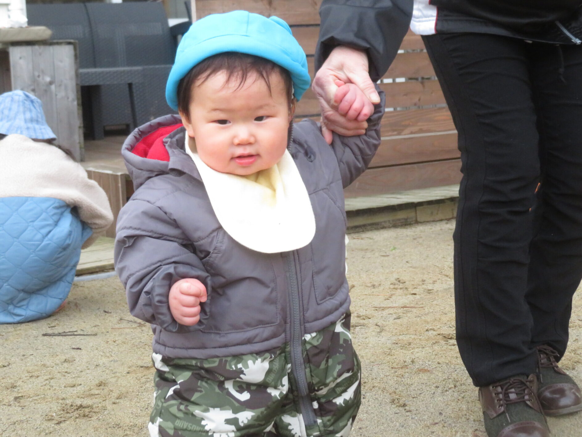 先日までおんぶで友だちが園庭で遊ぶ姿をみたり、テラスに座ってみたりしていた男の子。