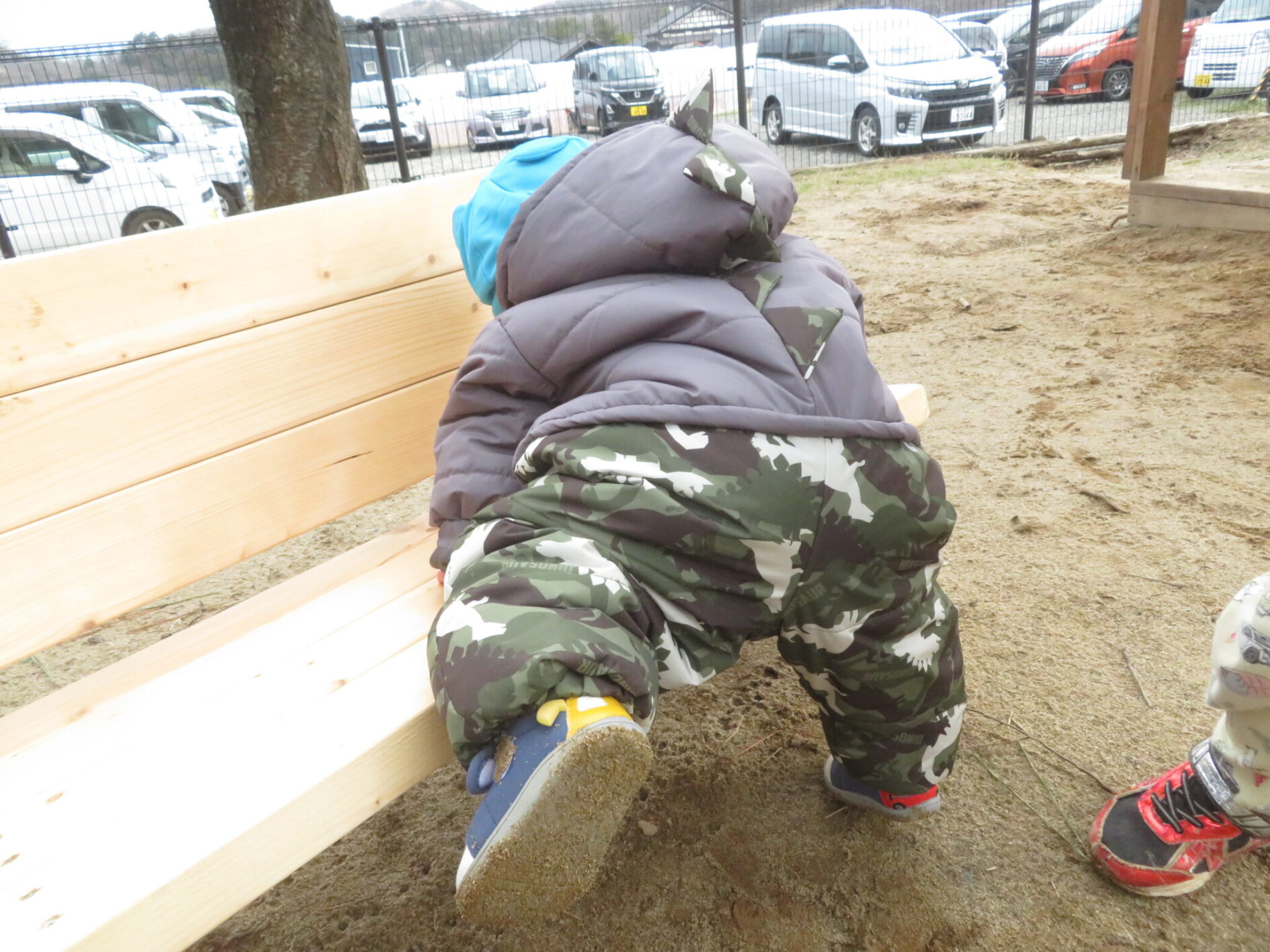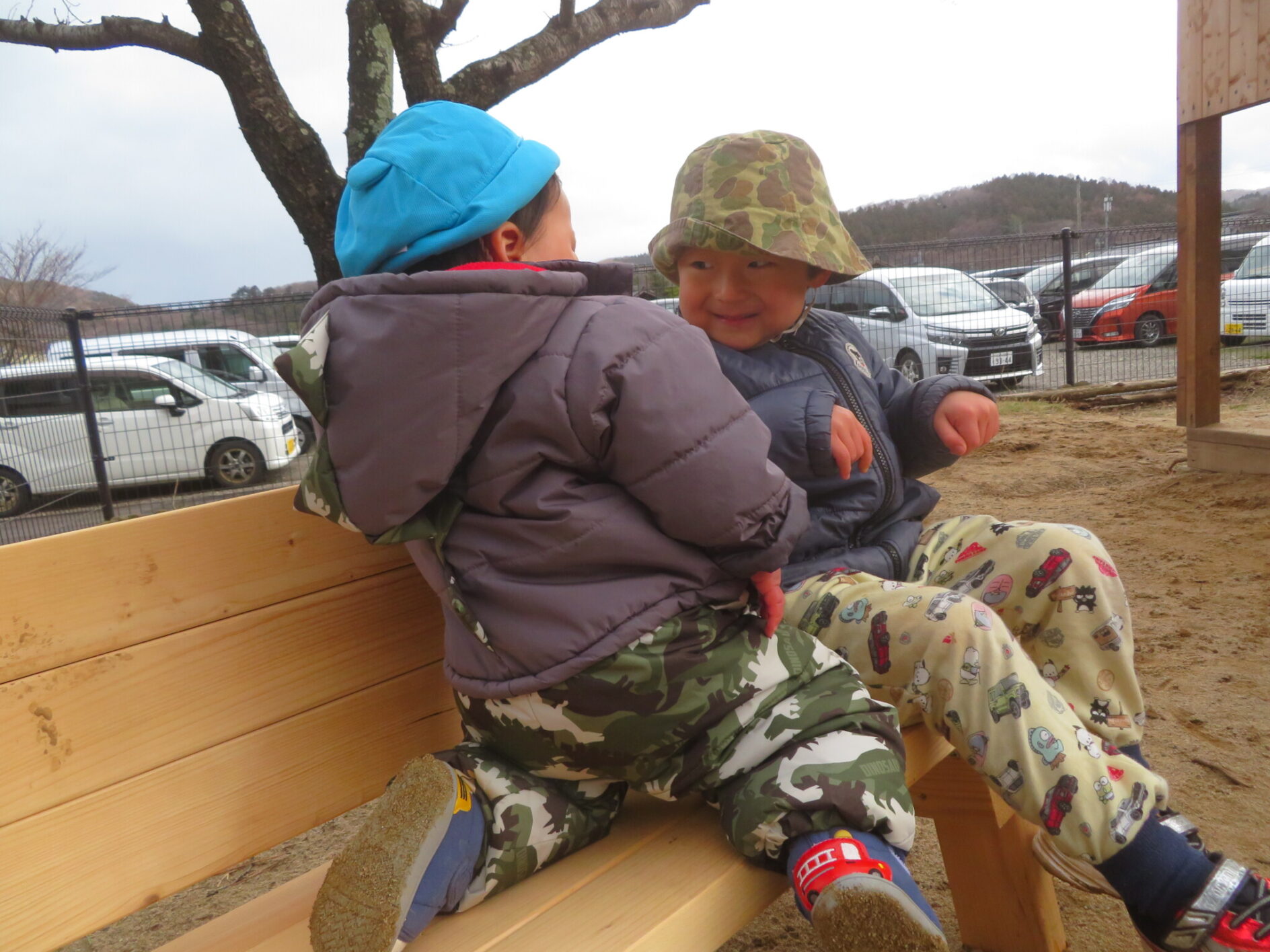 先々週に井上先生が来園された際作ったベンチに保育者と一緒に座ると、少しずつ落ち着いていきました。