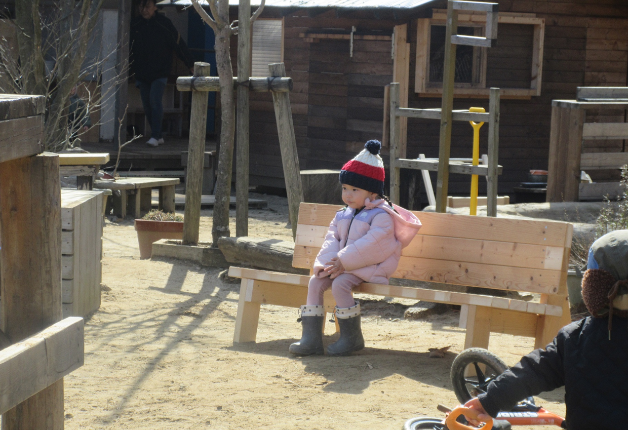ベンチは、ただ座る場所というだけでなく、子どもたちにとって心を落ち着ける「安心の場所」にもなっているのだと感じました。穏やかな時間が流れるひとコマでした。