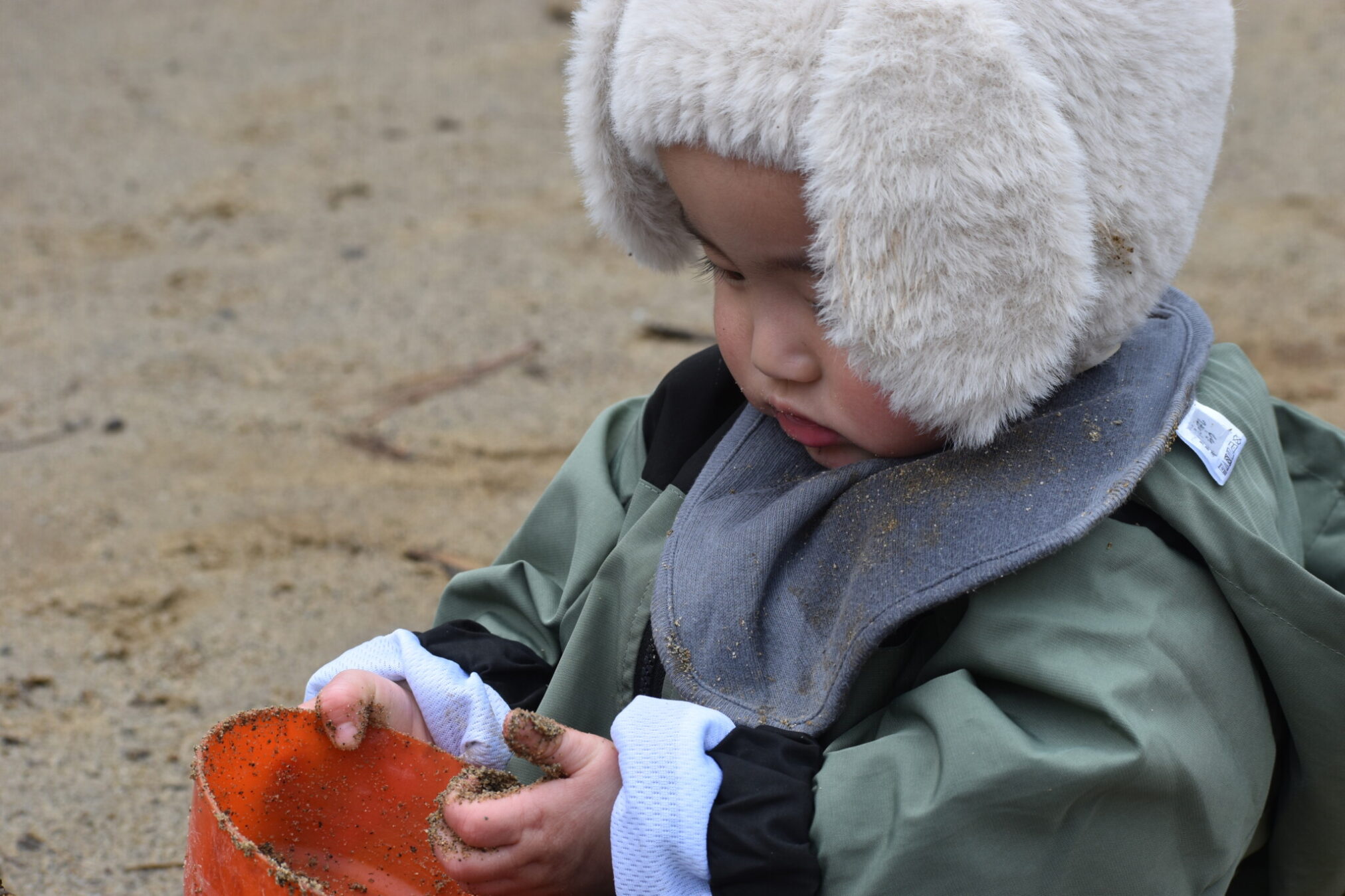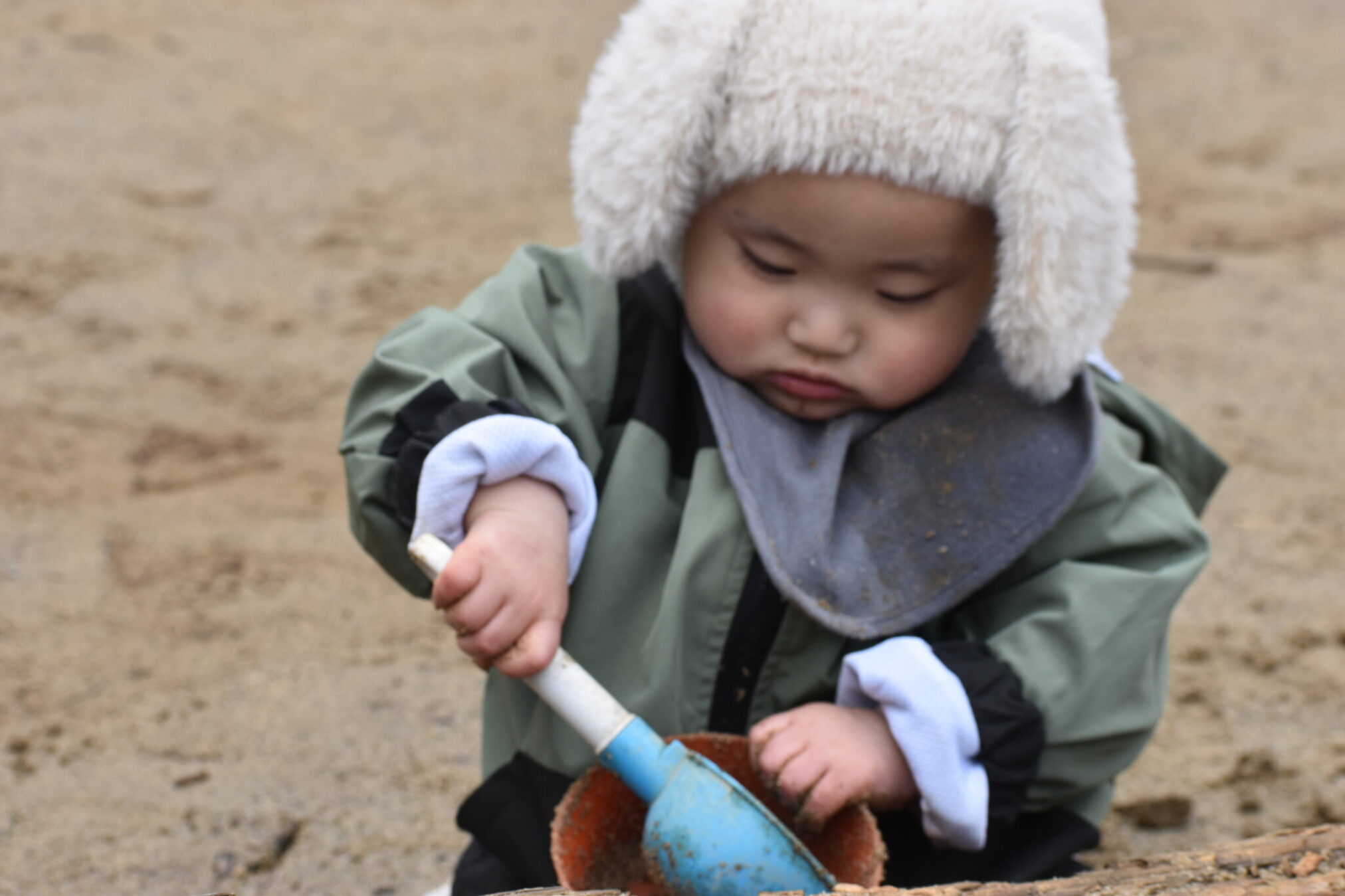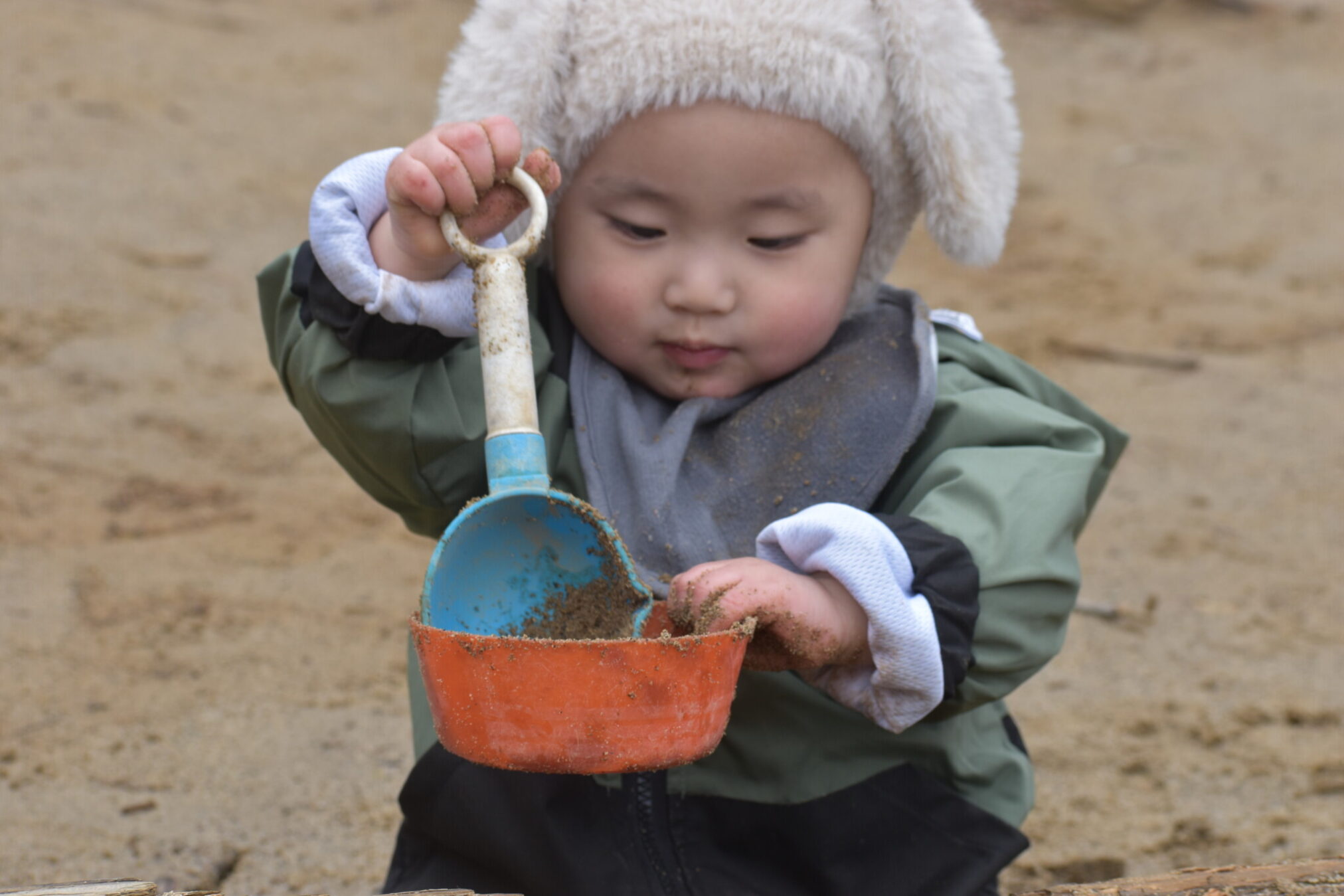 保育者が砂場でお椀にシャベルで砂を入れてケーキのように作って遊んでいると興味を持ってきた男の子。