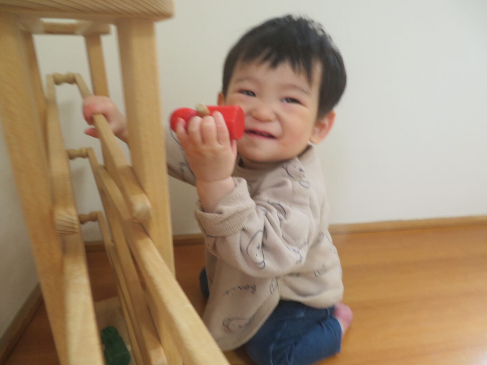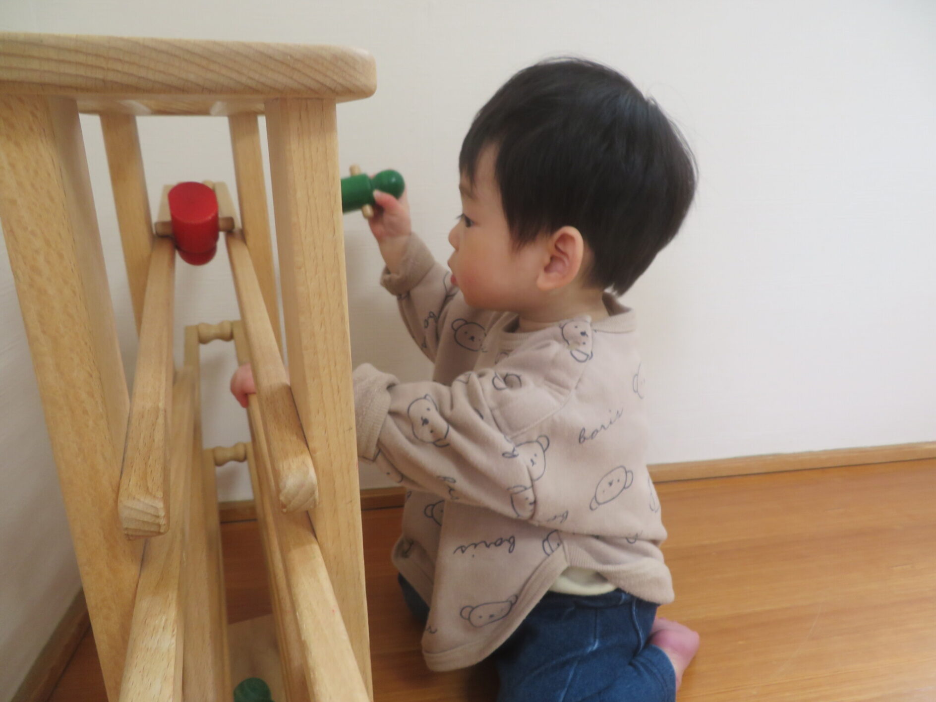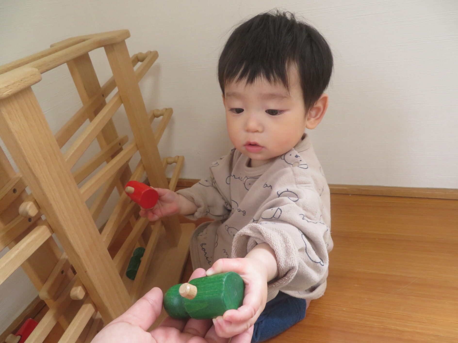 保育者に渡してきて、もう一回転がしてほしい気持ちを表してくれました。