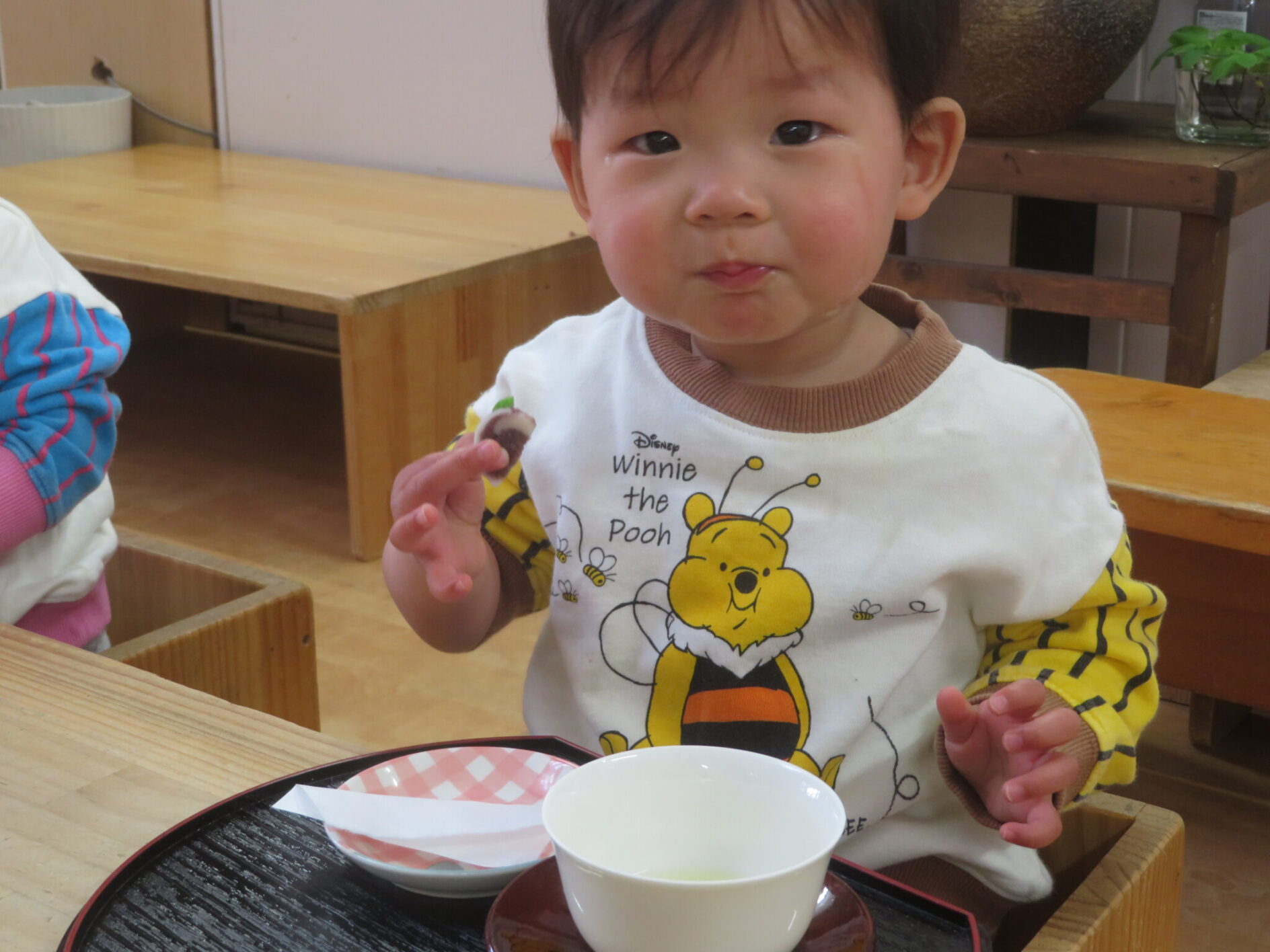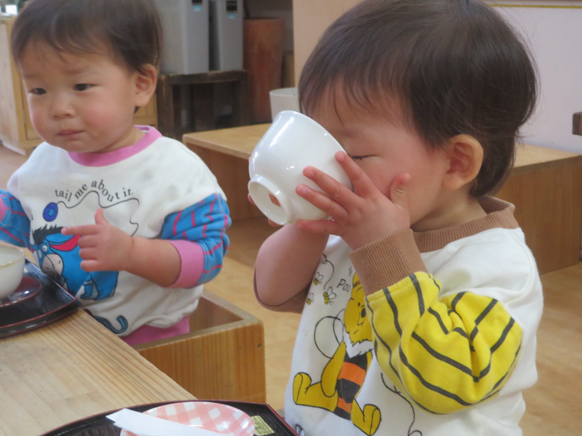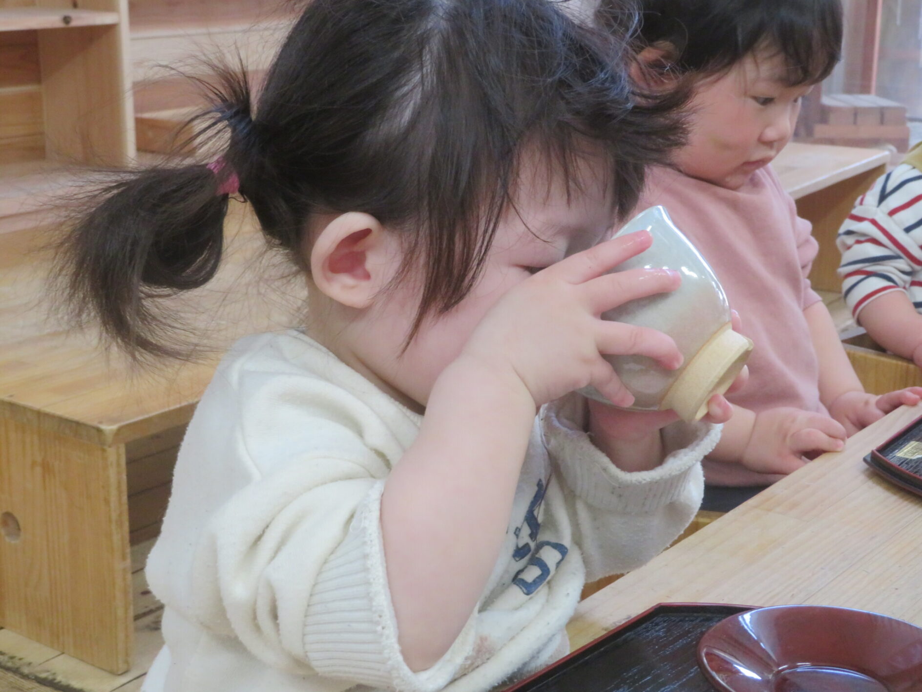 お兄さん、お姉さんたちの素敵な姿を見た後だったのでお茶碗を両手で持つことを真て、飲むことが出来ました。